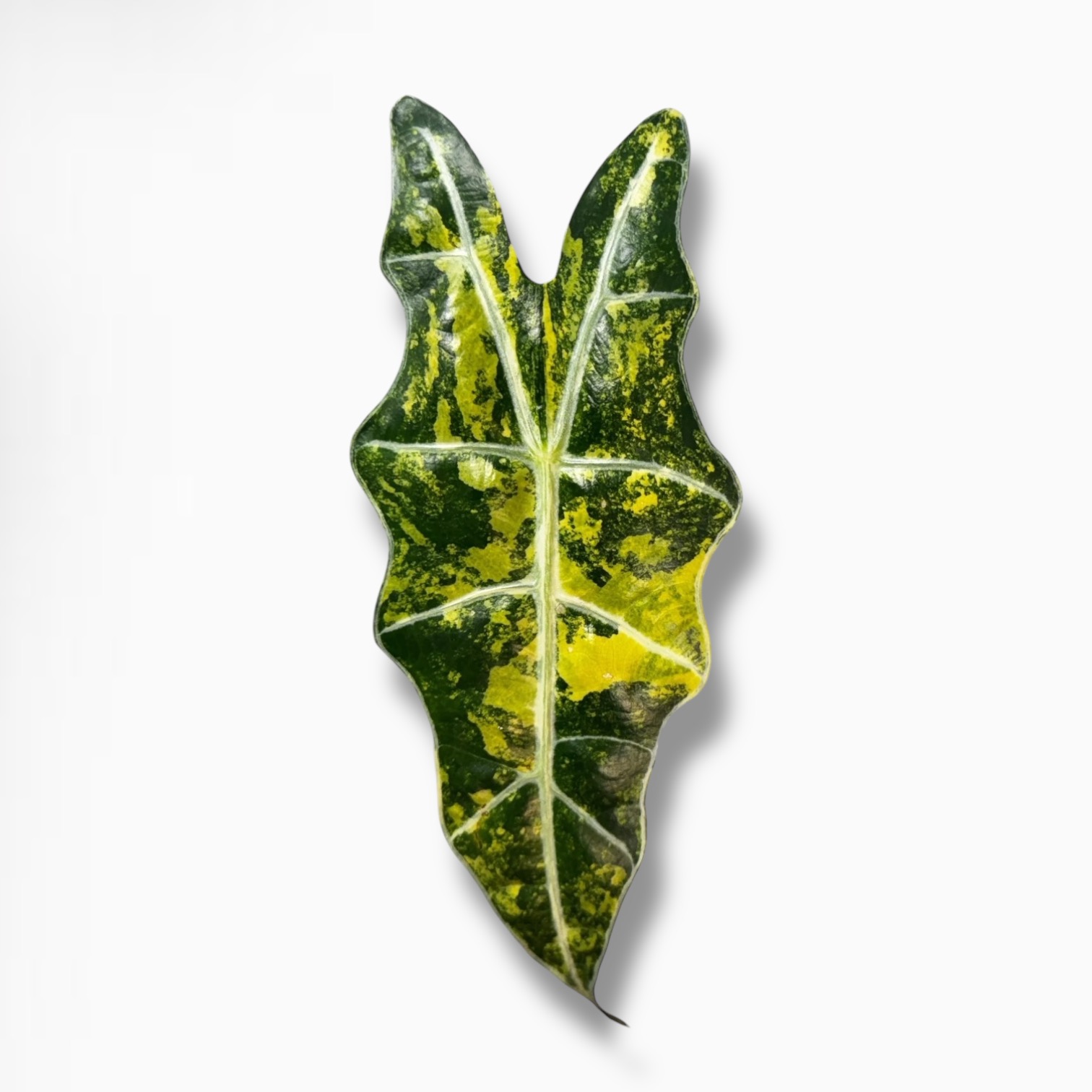 Алоказия Сандериана Вариегата — редкая вариегатная форма культовой Alocasia sanderiana с хищной графикой и контрастной окраской. Листья узкие, стреловидные, с глубокими вырезами по краю и ярко выраженными светлыми прожилками. Вариегатность проявляется в кремовых, светло-жёлтых и салатовых участках, которые резко контрастируют с тёмно-зелёной, почти чёрной основой. Каждый лист уникален.