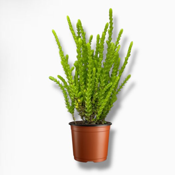 Крассула Ликоподиоидес — необычный суккулент с плотными вертикальными побегами, покрытыми мелкими чешуйчатыми листьями. По форме растение напоминает миниатюрный хвощ или коралл, из-за чего выглядит очень графично и нестандартно. Окраска варьируется от насыщенно-зелёной до слегка серебристой, а на ярком свете может приобретать тёплый оттенок.