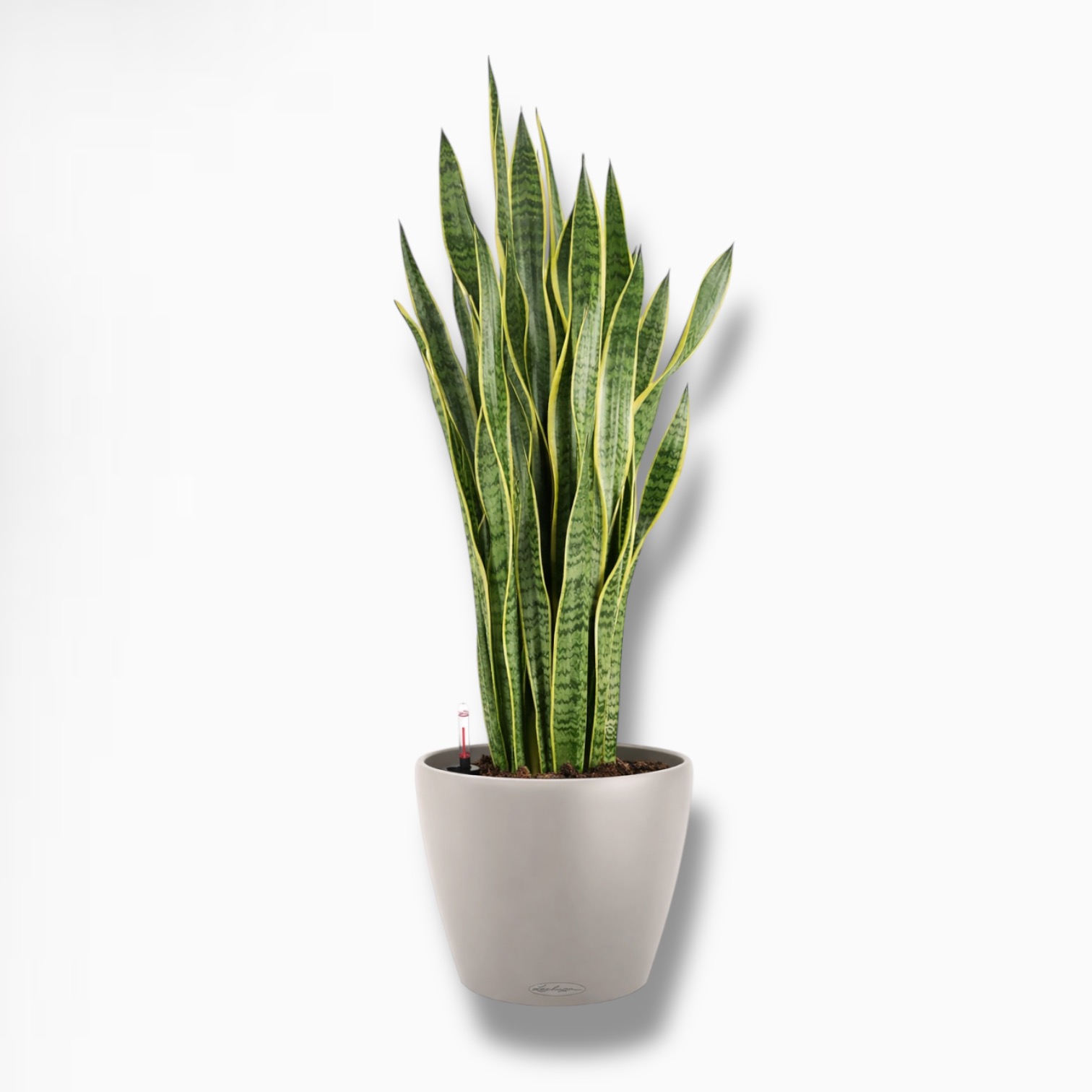 Сансевиерия Лауренти в кашпо с автополивом — надёжный, стильный и максимально удобный вариант для современных интерьеров.